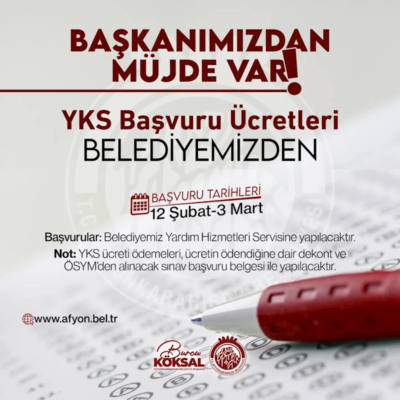 Afyonkarahisar Belediyesi, Gençleri YKS’de DestekliyorAfyonkarahisar Belediyesi, 25 yaş ve altındaki gençlerin Yükseköğretim Kurumları Sınavı (YKS) başvuru ücretlerini karşılayacağını duyurdu. Bu destek programı ile gençlerin eğitim yolculuklarına katkı sağlanması hedefleniyor.
